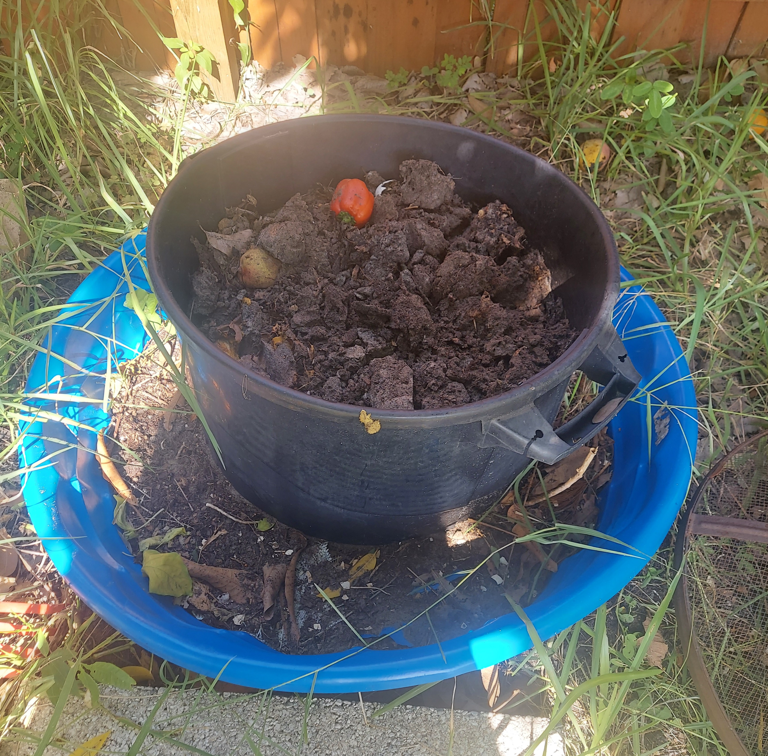He uses a plastic composting bin from Amazon.